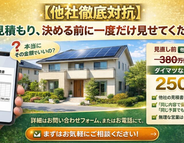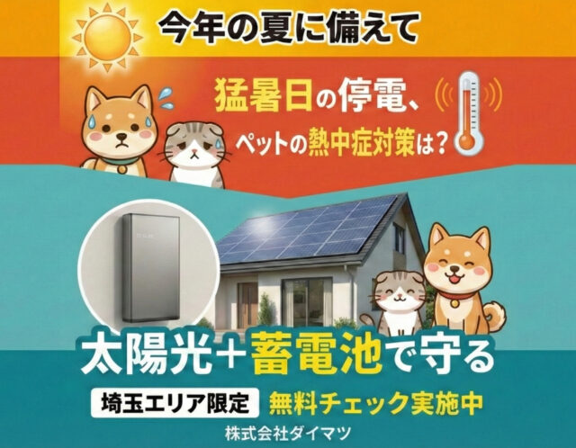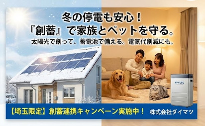 キャンペーン CAMPAIGN ホーム キャンペーン 2026.01.28 冬の停電も安心!太陽光と蓄電池の『創蓄』で家族とペットを守る暮らし 2026.01.25 【埼玉限定】猛暑日の停電、あなたの大切な家族を守れますか?ペットのための「停電対策」無料診断キャンペーン 2026.01.22 【他社徹底対抗】蓄電池の見積もり、決める前に一度だけ見せてください! 2026.01.07 【他社徹底対抗】太陽光+蓄電池セット(創蓄連携システム)の見積もり、決める前に一度だけ見せてください! 2026.01.07 【新機能】30秒で相場がわかる!「太陽光・蓄電池 簡易シミュレーター」を公開しました
